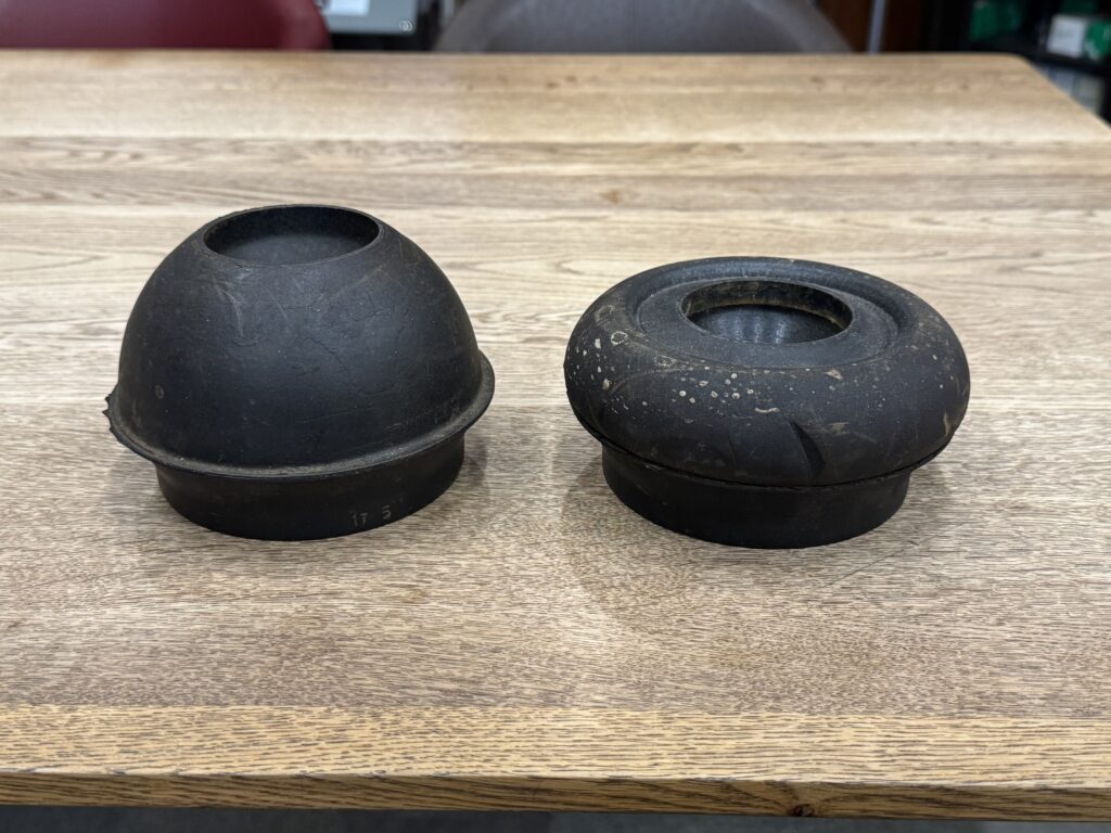 青木社長はそう言って修理したサブフレームと共に、縮んでカチカチになってしまったラバコンと新品のラバコンを見せてくれた。何度も見たことがある劣化したラバコンだけれど、改めて見て新品と比べて見ると、その変形ぶりには驚く。