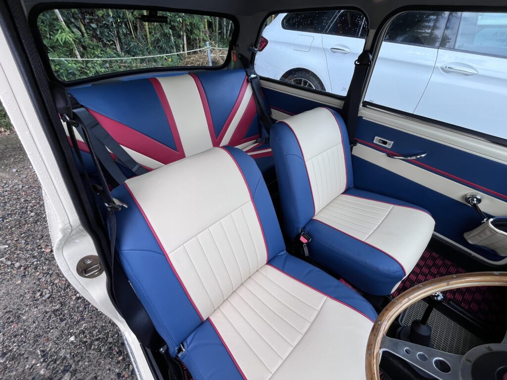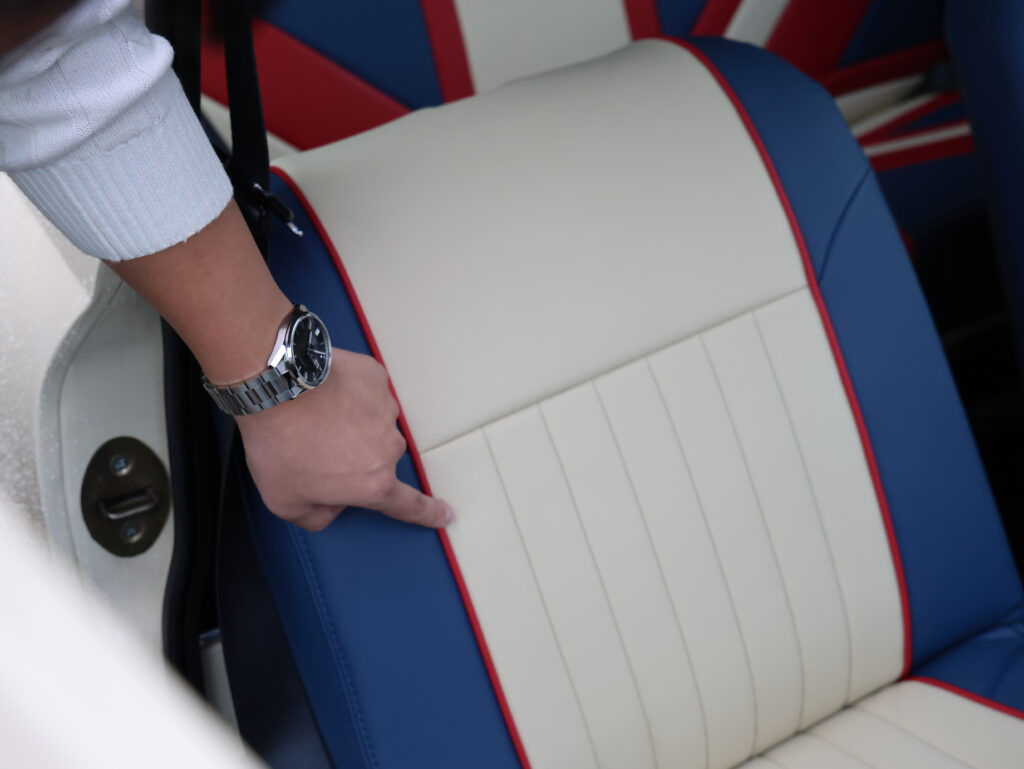 そして「シートはスタッフさんとの相談で、ちょっと遊んじゃいました」と言う通り、ユニオンジャックをモチーフにした大胆なデザイン。それでもボディカラーに合わせてアイボリーと、やや落ち着いた青と赤を使ったコーディネイトにしたあたりにセンスを感じさせる。