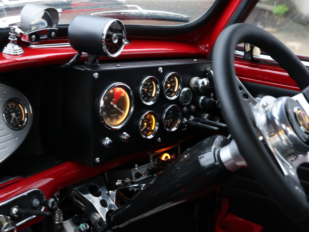内装もオーバルのセンターメーターを組み込むだけでなく、運転席側にはワークスタイプのダッシュパネルが取り付けられ、たくさんのサブメーターとスイッチが組み込まれた。