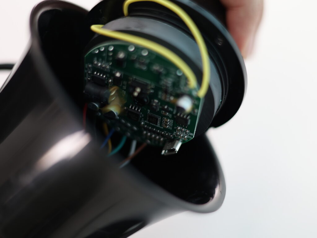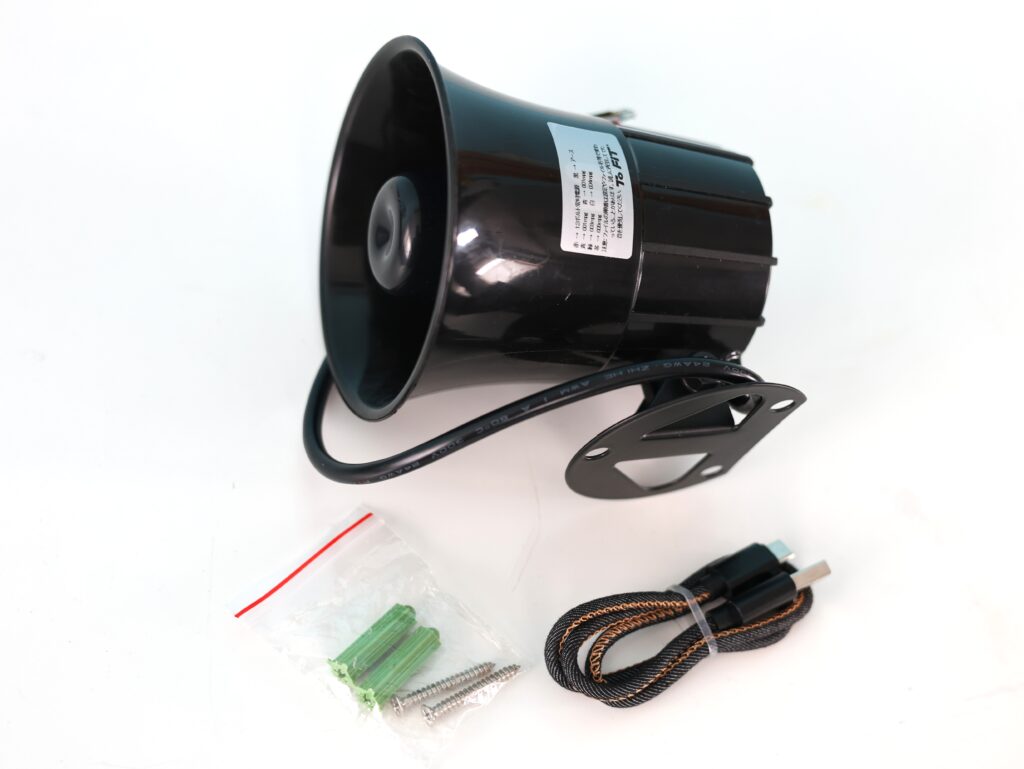 カーボイス1は、スピーカー内部に制御基盤を組み込んだ、1ユニットでシステムが完結している音声発生装置。mp3形式の音源をインストールしてファイル名を信号と紐づけるだけで、スイッチ操作で希望通りの音を発生させられるのだ。